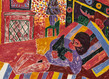Parmi les peintures, on trouve plusieurs portraits de femmes aux traits abstraits, dans des intérieurs richement décorés, comme dans Cherry Dress ou Emma Reading. Évoluant avec aisance à l’intérieur et à l’extérieur de la figuration, les palettes de couleurs et les motifs, ainsi que les postures et les formes des sujets, évoquent l’œuvre d’Edvard Munch (1863–1944) ou d’Henri Matisse (1869–1954). Dans un autre tableau, un enfant déguisé en chat regarde ses pieds, les sourcils froncés et les cheveux en bataille. Intitulée Cat Costume, la composition nous rappelle que Tal R peint souvent ses sujets — en train de lire, de se prélasser, de dormir ou de danser — jusqu’à la caricature, mais sans ironie. Une chose fascinante pour un artiste, explique-t-il, est de devoir inventer un langage pour tout ce qui existe : un nez, une coiffure, un froncement de sourcils. Dans plusieurs œuvres, notamment Night Window and Gone et Children Sleeping, la nuit elle-même devient une source d’inspiration pour l’artiste. Dans ce dernier tableau, deux enfants dorment dans un lit, blottis sous un drap de peinture noire marbrée. À quoi rêvent ces enfants endormis alors que nous les observons ? Que signifie regarder quelqu’un qui est « ailleurs » ? Une œuvre réussie, selon Tal R, possède plusieurs points d’accès et s’ouvre à de nombreux regards.
